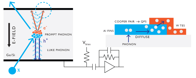 SuperCDMS SNOLAB The SuperCDMS (Cryogenic Dark Matter Search) SNOLAB experiment, the fourth generation of the CDMS project, is a DOE/NSF funded direct detection dark matter search experiment that exploits the nuclear recoil energy induced by dark matter-nucleus scattering through phonon and ionization signals. The phonon signal warms up the tungsten TESs (transition-edge sensors) and the current change in the input coil is measured with SQUID (superconducting quantum interference device) arrays while the HEMT (high electron mobility transistor) amplifier is used to measure the ionization signal. There are two types of detectors, iZIP (interleaved Z-dependent Ionization and Phonon) and HV (high-voltage) detectors, where the phonon and ionization signals in the iZIP detector provide an excellent signal-to-noise ratio while the HV detector can have a significantly low energy threshold with the enhanced phonon signal from the Neganov-Luke effect. Detectors are deployed in the underground facility and operated at temperatures about 50 mili-Kelvin to minimize the background and noise. |